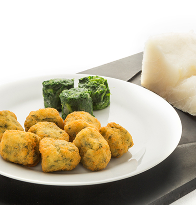 INGREDIENTES: Bacalao, espinacas, leche, harina, mantequilla, pan rallado, ajo, aceite y sal.